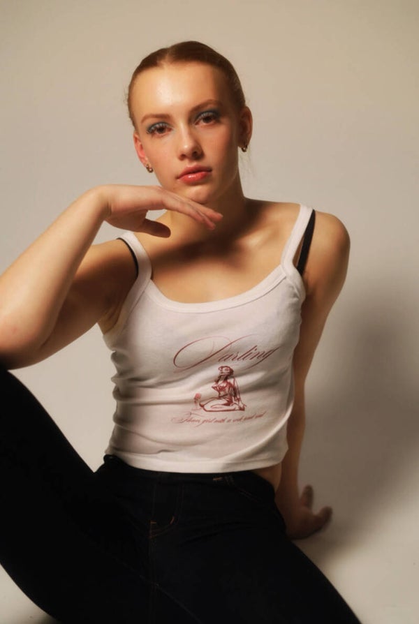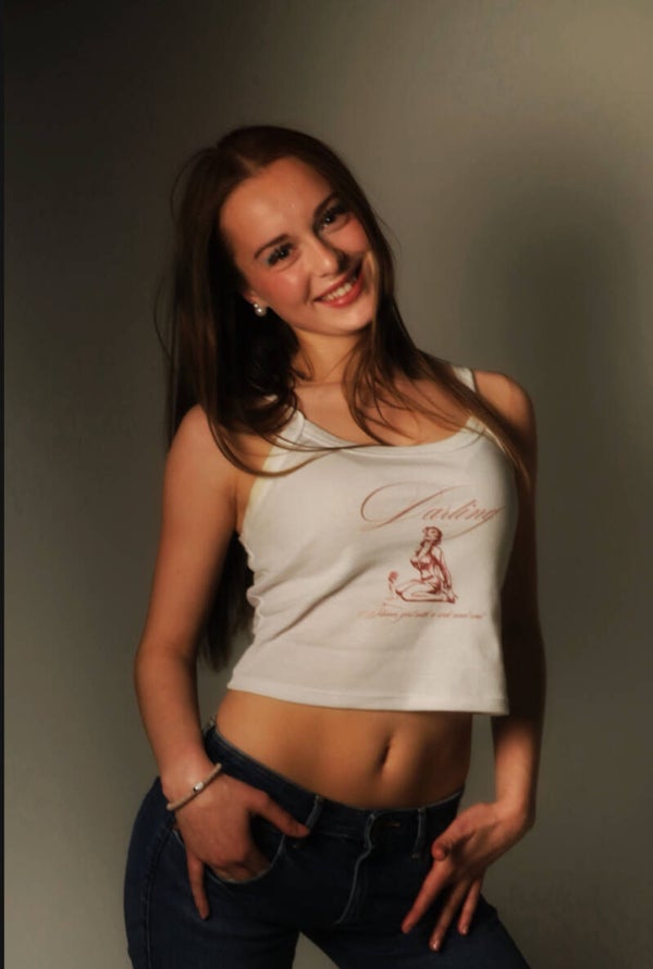 This beautiful cropped tank top blends a soft vintage aesthetic with a modern, flattering fit. Made from a smooth and breathable fabric, it features a delicate “Darling” illustration in a deep red tone—perfect for both casual outfits and more styled looks.
